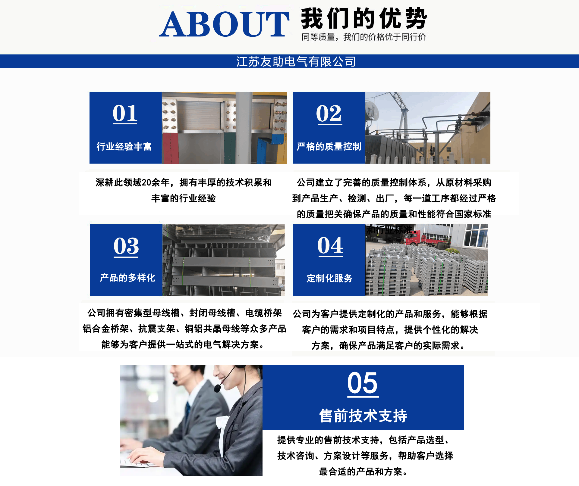 江蘇友助電氣有限公司地處中國工程電氣生產(chǎn)基地-一江蘇省揚(yáng)中市。經(jīng)營范圍:電纜橋架,母線槽(橋),管型母線,銅軟連接(伸縮節(jié)),高低壓開關(guān)柜,配電箱,抗震支架產(chǎn)品系列?!」咀谥迹嚎蛻糁辽?。已成功為江蘇二十屆省運會會場-泰州體育館,南京寶龍商業(yè)綜合體,張家口百兆瓦風(fēng)電場,濟(jì)源市婦幼醫(yī)院,威海市未來科技園,湖北皇恩燁新材料科技有限公司,南京中央路小學(xué),南通中天大酒店,新疆新安特鋼有限公司,河北省送變電有限公司,南京南微醫(yī)學(xué)研發(fā)基地等多項工程配套服務(wù),我們愿與您精誠合作,互利共贏!公司技術(shù)人員深耕橋架,母線領(lǐng)域30年,為您提供橋架,母線槽疑難問題解決方案。母線槽不論每相是單排,雙排,三根排重疊,不管有多少個水平彎、垂直彎,轉(zhuǎn)接排在發(fā)貨前預(yù)裝一遍,確保尺寸無誤。到現(xiàn)場直接擰螺絲,效率高,橫平豎直,規(guī)規(guī)矩矩,符合標(biāo)準(zhǔn),供電局,業(yè)主,監(jiān)理,驗收易通過。供貨周期3-7天。為了讓尊貴客戶您,設(shè)備安全通電,高枕無憂。我們提供如下售前售中售后服務(wù): 售前:免費技術(shù)支持,咨詢。 售中:免費現(xiàn)場精確測繪、設(shè)計?!∈酆?安裝服務(wù),免費指導(dǎo)?!≠|(zhì)量是生命,客戶是源泉。承諾客戶的,一定全力做到。讓我們一起進(jìn)步!...